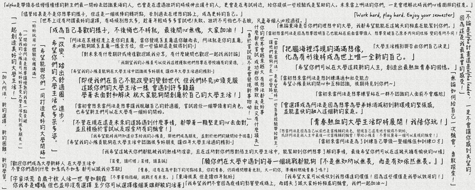 :其實我不知道耶....但是聽說Alpha是一個有一點神秘的地方,我高中的直屬學姐是東海的,他說他們都知道很多東海的冷知識,希望可以從他們身上聽到一些..