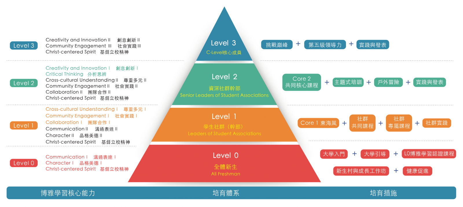 培育體系主要著重於全校性學生領袖社群階段性培力課程規劃與執行,並負責協助帶領學生領袖社群與實踐場域之發展,例如:Alpha Leader、住宿主體村。依據博雅學習八項核心能力,建構全校學生四階段博雅培育路徑。